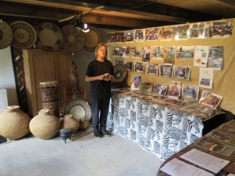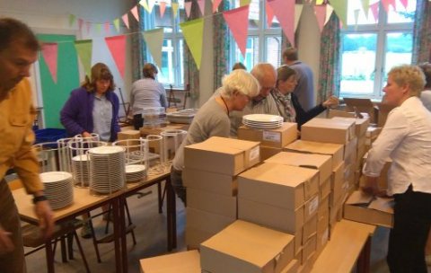 Det nye service pakkes ud i skolekøkkenet - skal bruges til aftenfesten